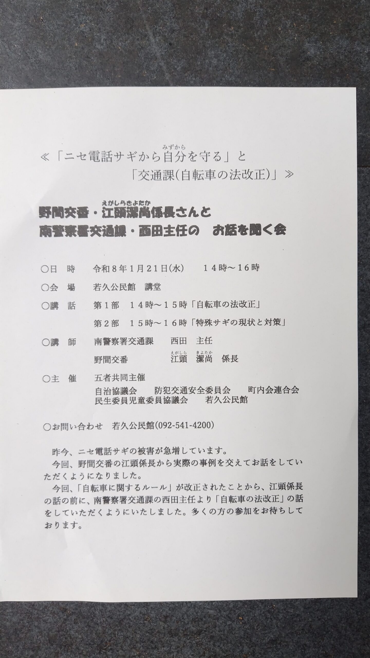 ニセ電話サギから自分を守ると自転車の法改正の講演